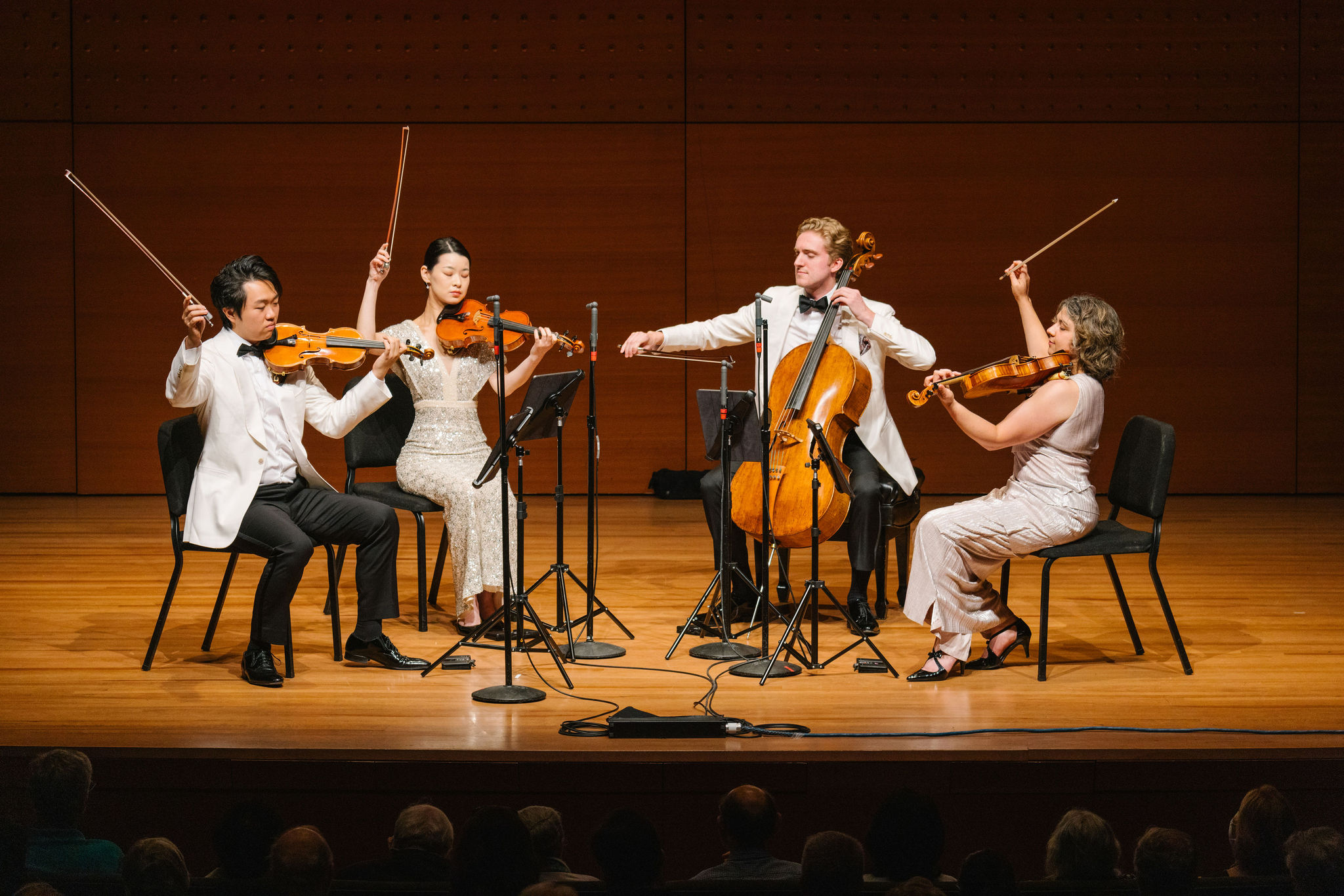 Above, the Viano Quartet: Hao Zhou & Lucy Wang (violins); Tate Zawadiuk (cello); and Aiden Kane (viola). Photo by Da Ping Luo.