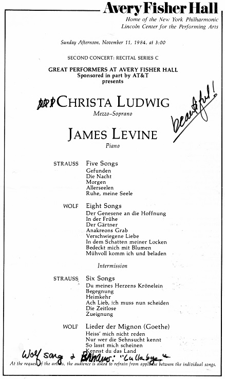 Christa Ludwig was a beloved recitalist; in 1984, I had the great pleasure of hearing her at Avery Fisher Hall with James Levine at the piano. The program of Strauss and Wolf lieder ended with a marvelous encore: the Brahms “Wiegenlied”.